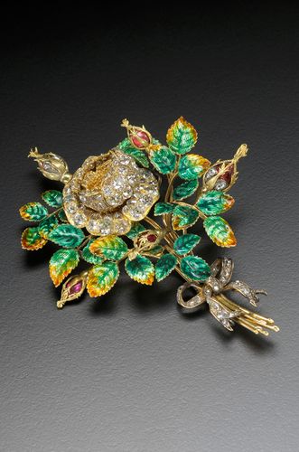 Yellow gold and silver brooch depicting a bouquet of roses, one of which is in bloom set with brilliant-cut diamonds, the buds adorned with cabochon garnets and diamonds and chiseled gold, and the leaves in natural enameled gold. Provenance: Elsa Schiaparelli (photo).