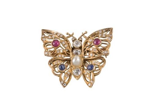 18K yellow gold butterfly brooch, openwork wings set with cabochon sapphires and rubies and diamonds, the body set with old-cut brilliant-cut diamonds and a fine pearl.