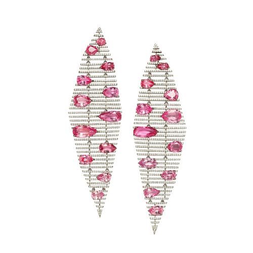 Pair of long articulated earrings in titanium set with natural spinelles and diamonds.