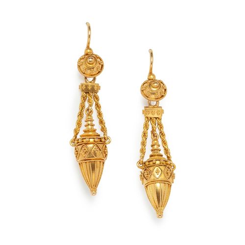 Pair of archaeological style earrings in yellow gold, in the shape of amphorae decorated with filigree and granulation, circa 1880.