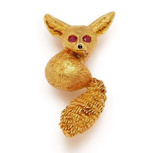 Brooch depicting a fennec fox in 18K yellow gold, with ruby eyes and an onyx nose.