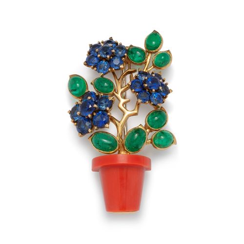 Yellow gold planter brooch, decorated with small flowers set with blue sapphires and the foliage in emerald cabochons, coral pot.