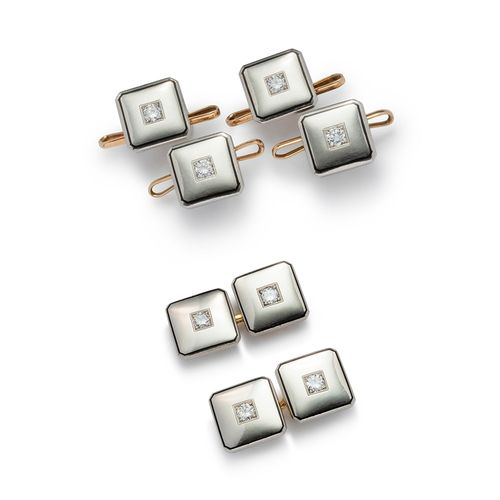 Art deco tuxedo set comprising a pair of double cufflinks and four square-shaped yellow gold and platinum shirt buttons set with a diamond in the center and surrounded by a black enamel fillet, circa 1920.
