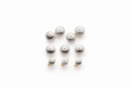 Tuxedo set including a pair of double cufflinks, 3 shirt buttons and three breastplate buttons, in yellow gold lined with white gold, discs bordered with a white enameled Greek key and centered with a diamond.