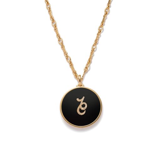 Long necklace in 18K yellow decorated with a pendant set with a circular onyx plate in its center the symbol of the sign of Capricorn set with brilliant cut diamonds.