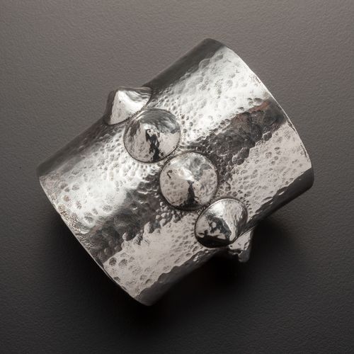 Rigid cuff bracelet in silvered bronze decorated with eight cones, René Robert circa 1934.