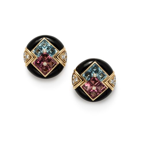 Round onyx earrings in 18K yellow gold, set with a square center of square-cut tourmalines and aquamarines.