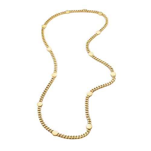 Long sautoir necklace in 18-karat yellow gold, adorned with gold discs set within the chain links.