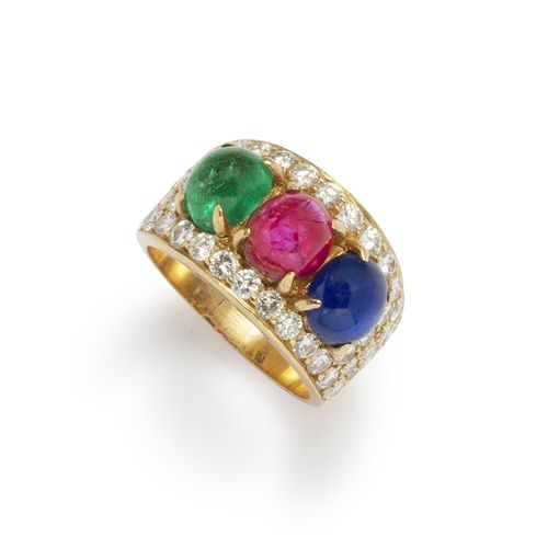 Yellow gold ring adorned with three cabochons, ruby, emerald and sapphire set between two rows of brilliant-cut diamonds.