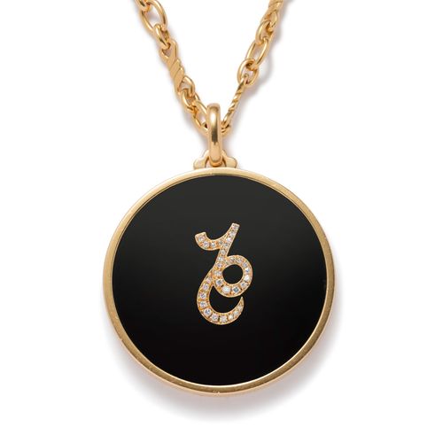 Long necklace in 18K yellow decorated with a pendant set with a circular onyx plate in its center the symbol of the sign of Capricorn set with brilliant cut diamonds.