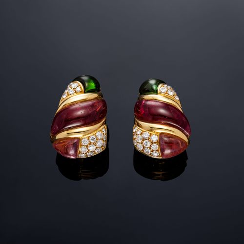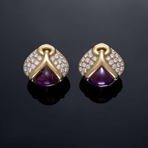 Earrings in 18K yellow gold each earring features a cabochon amethyst, enhanced with brilliant-cut diamonds +/- 4 cts F/G pure-VS