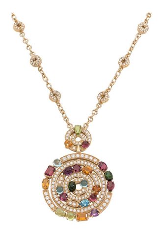18k yellow gold medallion pendant necklace composed of several circles set with brilliant-cut diamonds and cabochon gemstones of various colors.