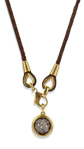 18K yellow gold "Monete" pendant set with a silver coin bearing the image of Alexander III (336-323 BC) "The Great" in a bezel setting, with a leather cord.