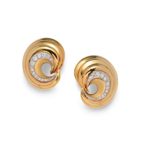 Paire de boucles d'oreilles en or jaune de forme ovale sertie en son centre de petits diamants taillés en brillant, Cartier vers 1950.
