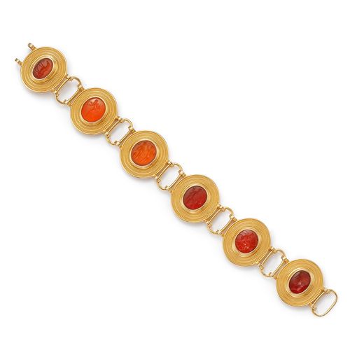 Archaeological style bracelet six intaglio set with carnelian in a large oval frame in Castellani filigree gold circa 1870.
