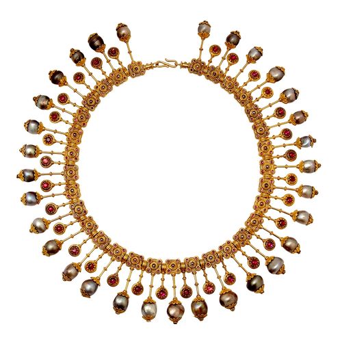Archaeological style necklace, gold, ruby and fine pearls. Rome, around 1880. A similar necklace from the case of Augusto Castellani's granddaughter now belongs to the collections of the Capitoline Museums in Rome.