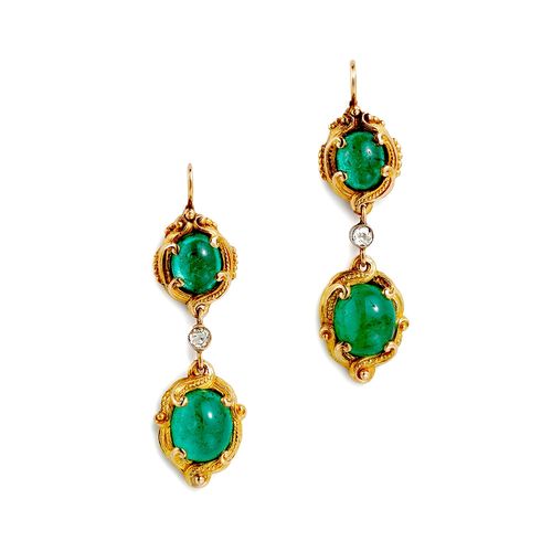 Art Nouveau earrings in 18K yellow gold each set with two emerald cabochons.