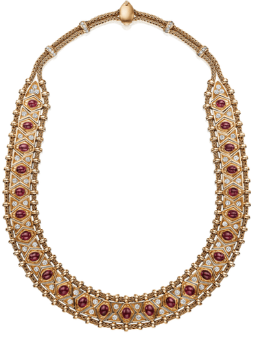A necklace composed of a flexible band of sculpted gold set with cabochon rubies and round diamonds, within a roped-gold surround; mounted in 18-karat yellow gold, with French assay marks