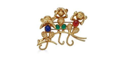 18K yellow gold brooch depicting the three wise monkeys perched on a branch, representing "see no evil, hear no evil, speak no evil."