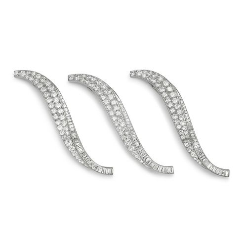 Three brooches numbered 1,2 and 3 "Flammes" model in platinum set with brilliant-cut diamonds and baguette diamonds accompanied by a certificate of expertise from Maison Van Cleef & Arpels.
